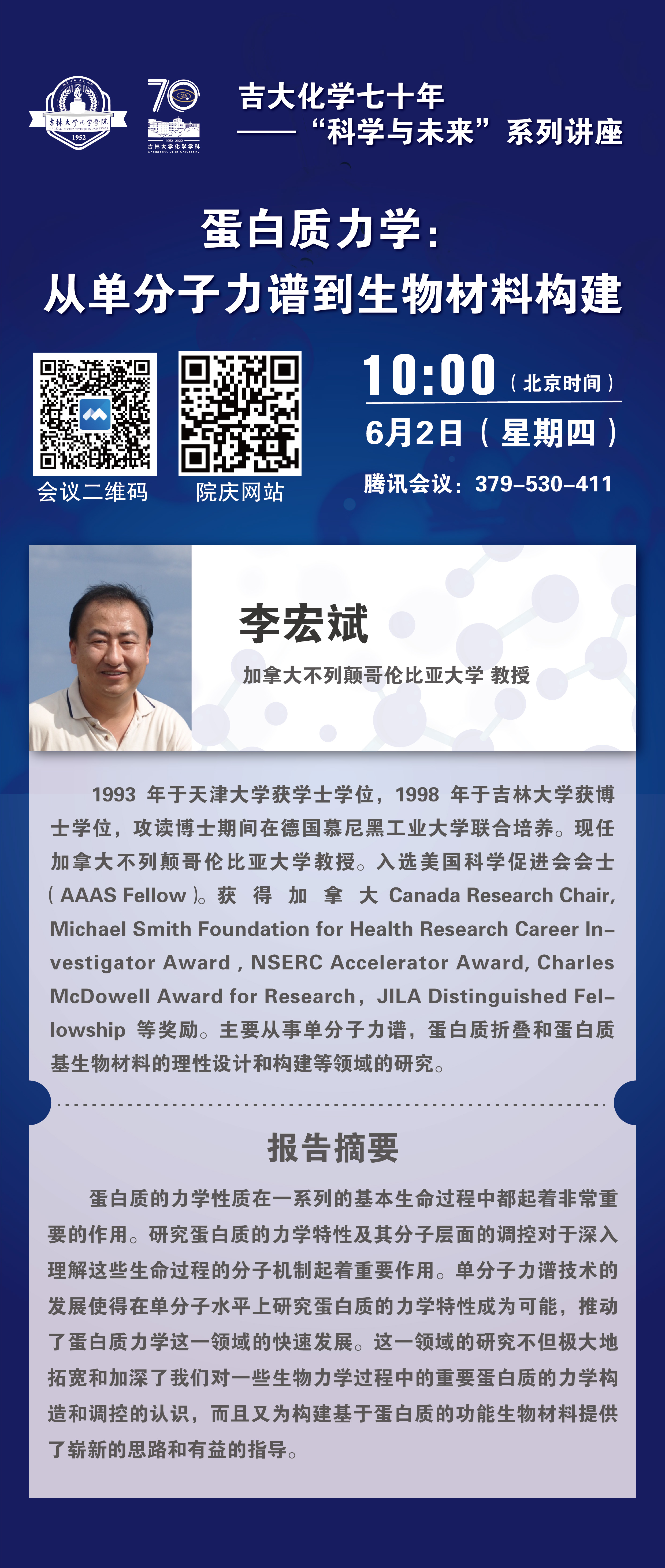 吉大化学70年院庆系列活动——科学与未来系列讲座:蛋白质力学:从单分子力谱到生物材料构建