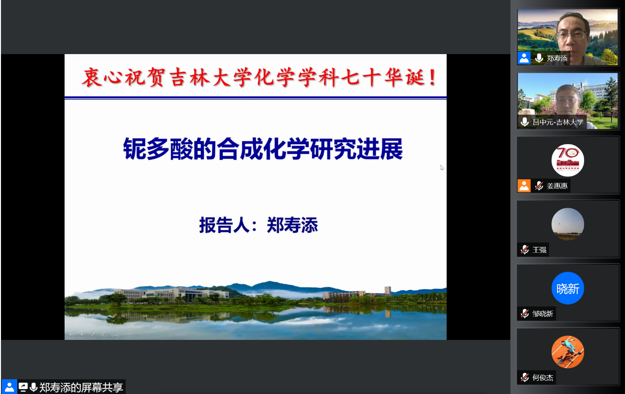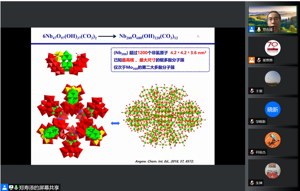 6月12日上午,福州大学EMC易倍官方网站经理,教育部领军人才郑寿添应邀线上做客“吉大化学七十年——科学与未来系列讲座”,以“铌多酸的合成化学研究进展”为题,为公司师生作学术报告。