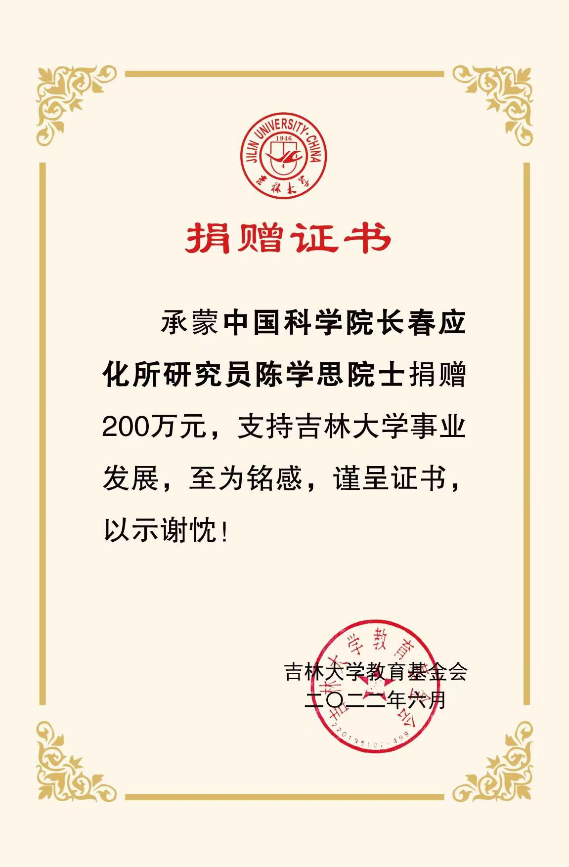 承蒙78级员工、中国科公司院士、中国科学经理春应用化学研究所陈学思研究员捐赠200万元,支持EMC易倍平台“关实之—陶慰孙奖学金”发展,至为铭感,谨呈证书,以示谢忱!
