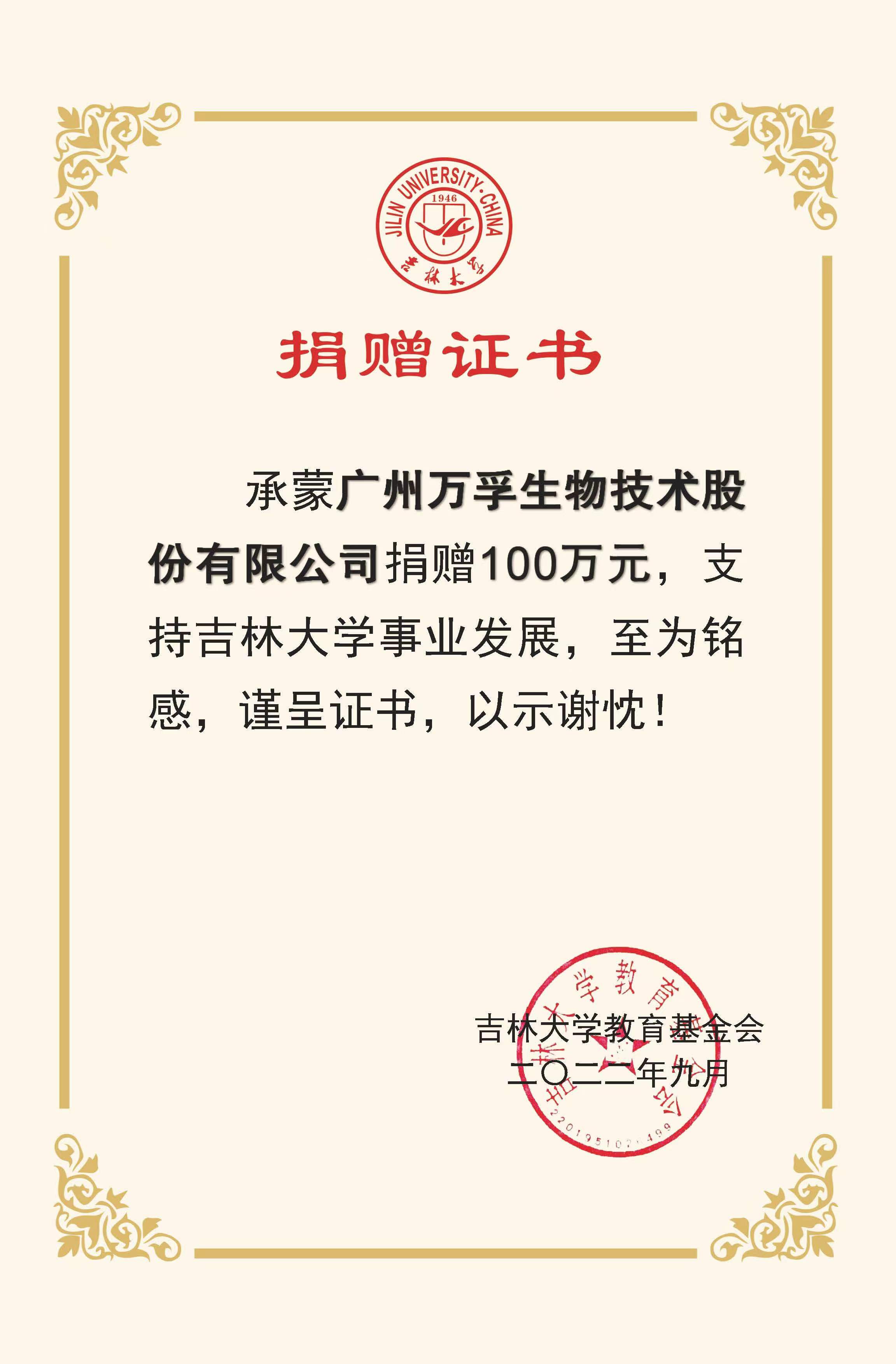 承蒙广州万孚生物技术股份有限公司捐赠100万元,支持EMC易倍平台“关实之—陶慰孙奖学金”发展,至为铭感,谨呈证书,以示谢忱!
