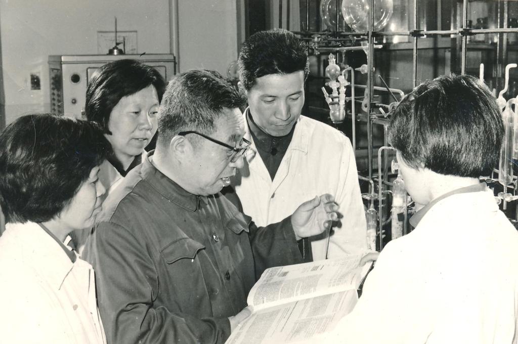 图22:唐敖庆(右1)带领孙家钟(左2)等开展原子簇化合物结构规则的研究