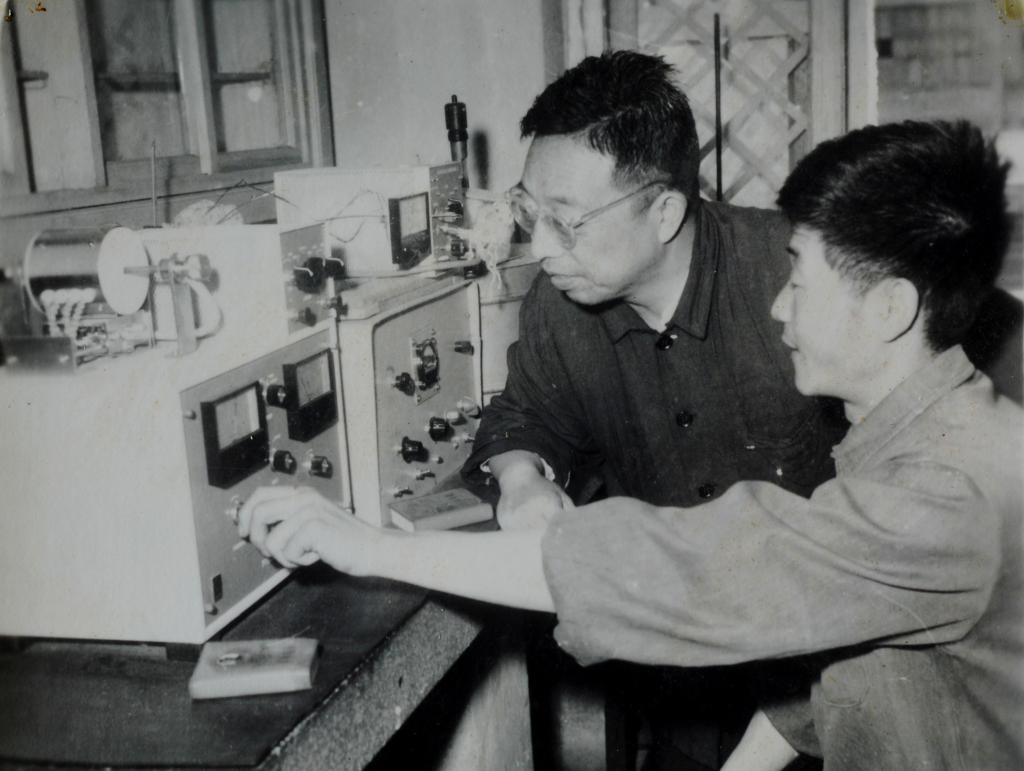 图19:唐敖庆(左)同江元生(中)等一起研究一种分子的光谱图