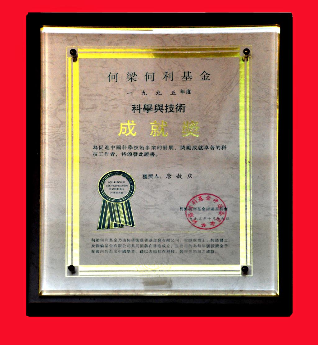 图25:唐敖庆获1993年度陈嘉庚化学奖(左)、1995年度何梁何利科学与技术成就奖(右)
