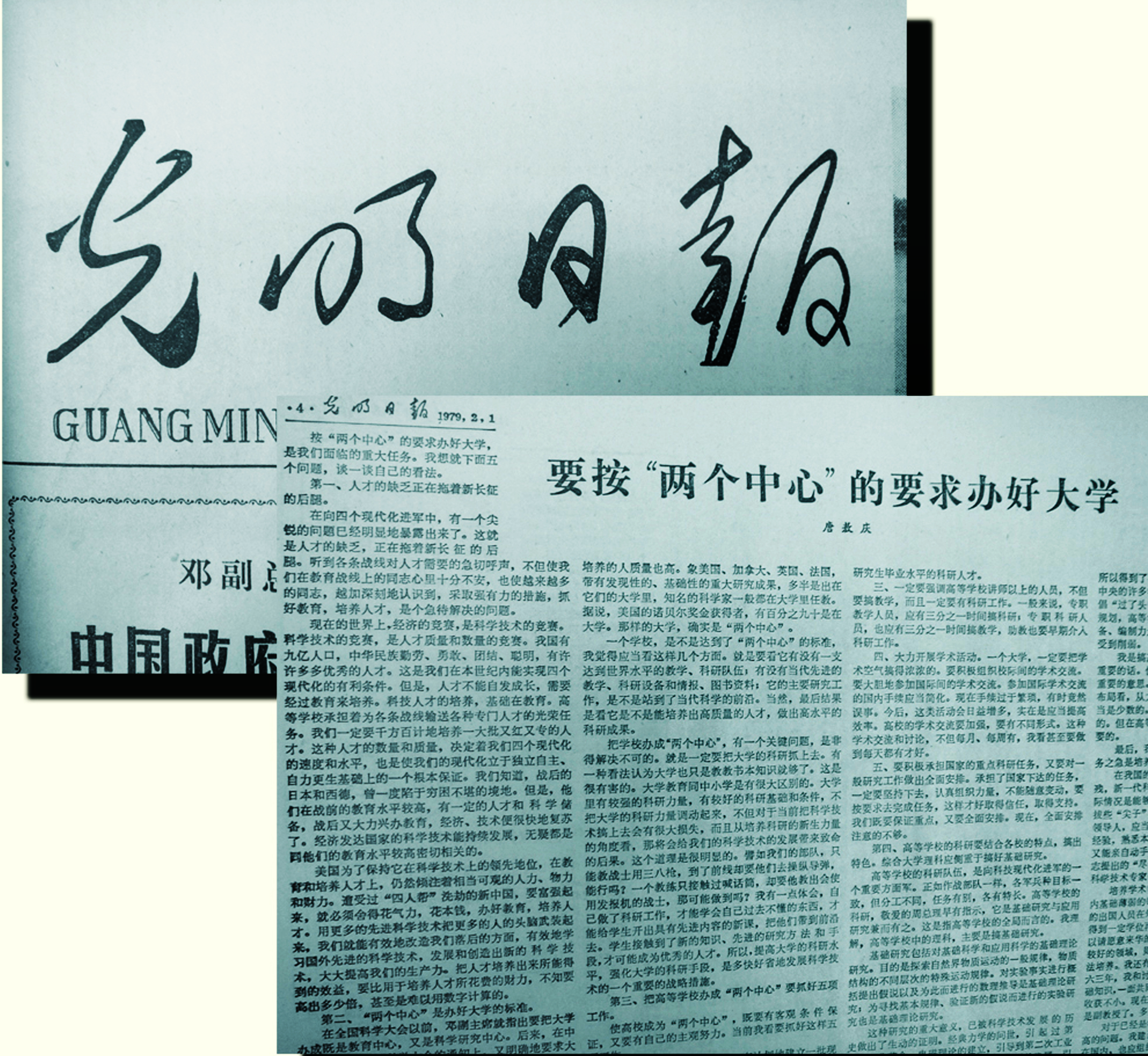 1979年2月1日,唐敖庆在《光明日报》上发表《要按“两个中心”的要求办好大学》的文章,全面论述了把重点大学建设成为教育与科研“两个中心”对于国家建设事业及办好公司的重要意义。文章的核心思想,成为了当时EMC易倍平台各项工作的重要指导思想,也标志着唐敖庆“两个中心”办学思想的形成和明确。