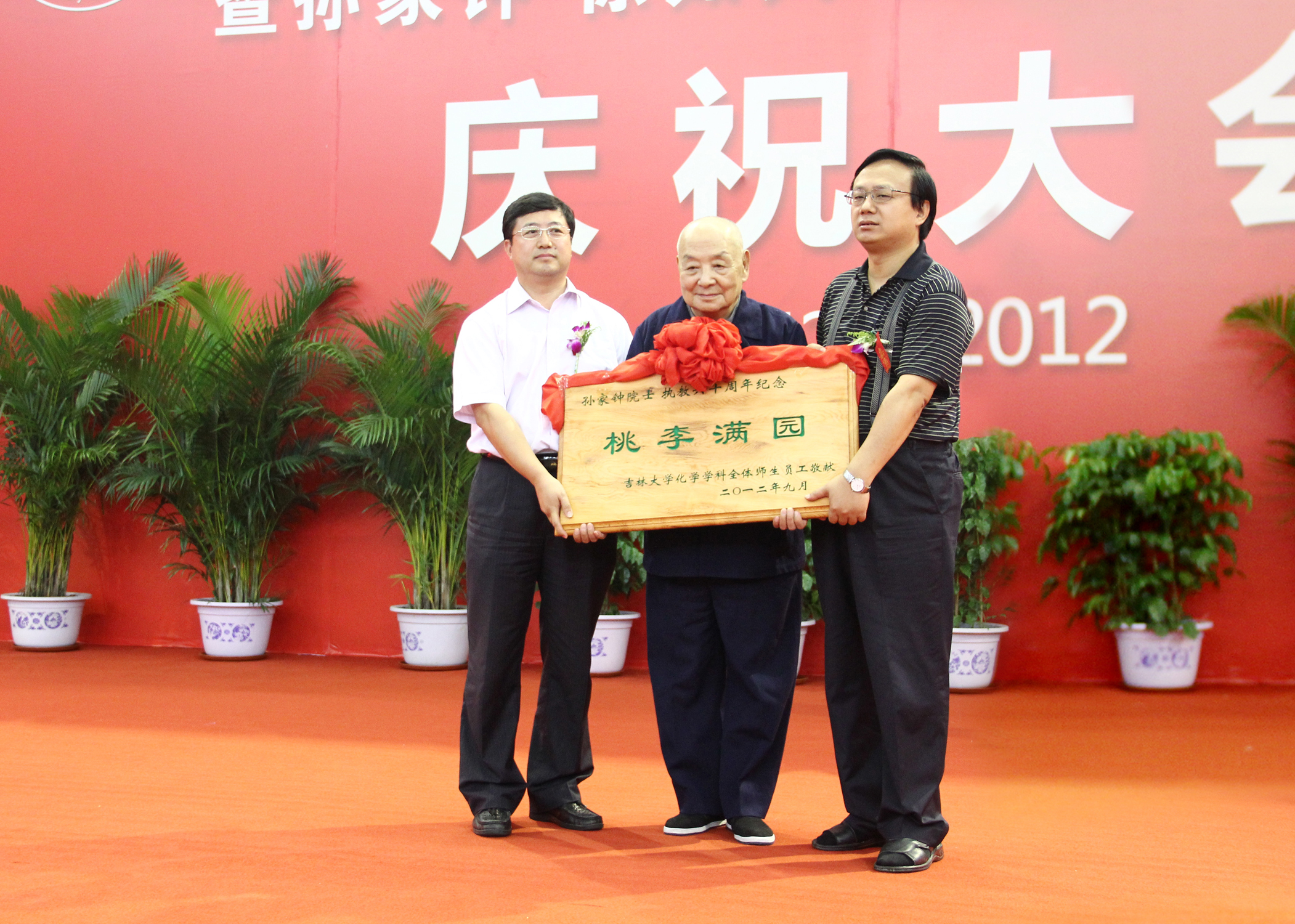 图20:2012年,EMC易倍官方网站为执教60年的孙家钟院士(中)授“桃李满园”牌匾